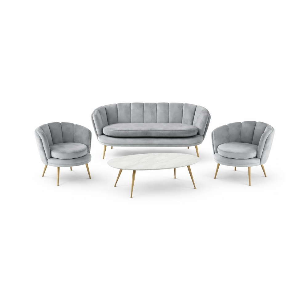 Élégant et contemporain, le salon Romy crée un espace lounge raffiné et accueillant. L’association du canapé argenté, des fauteuils gris et de la table basse effet marbre apporte une touche chic et harmonieuse, idéale pour structurer un espace détente lors de vos événements.